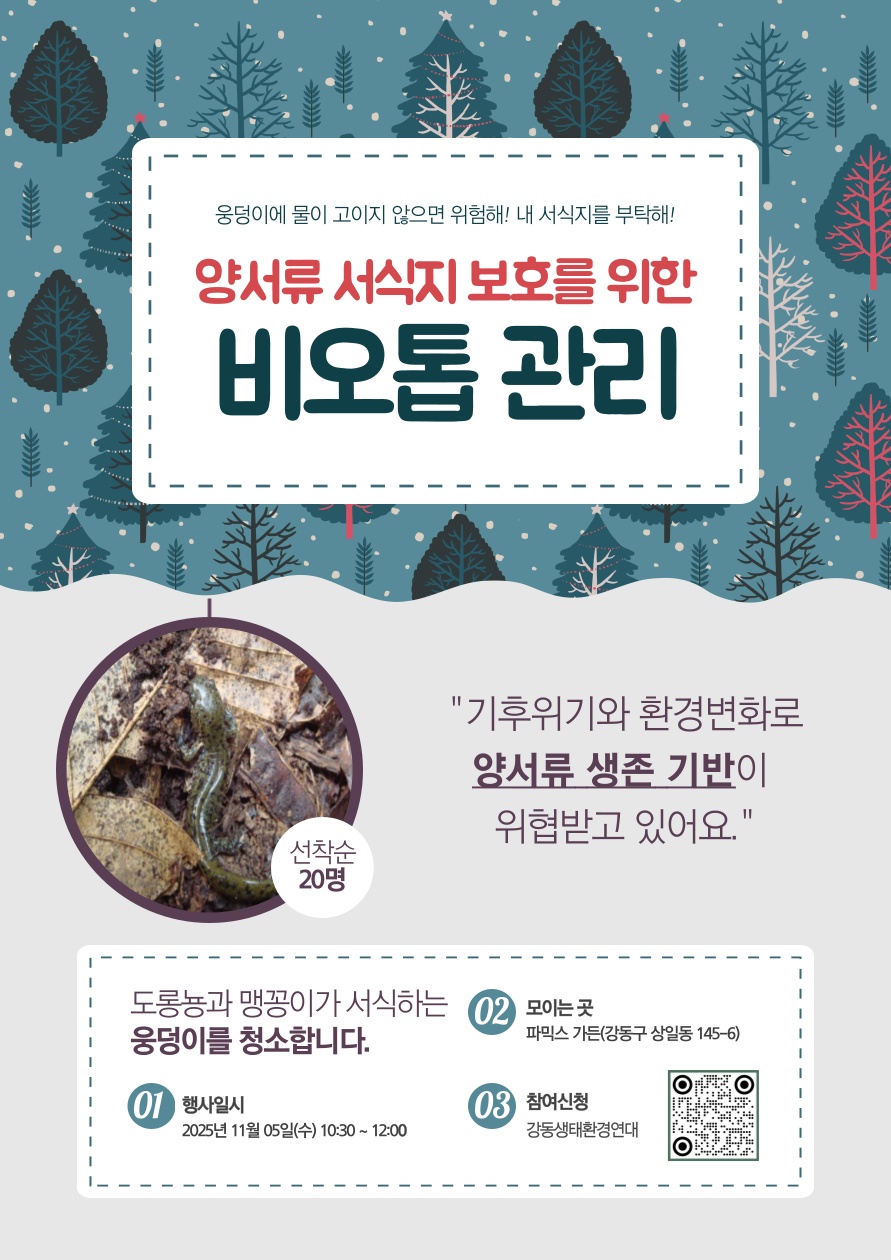 - 내용: 양서류(도롱뇽, 맹꽁이) 서식 웅덩이 청소