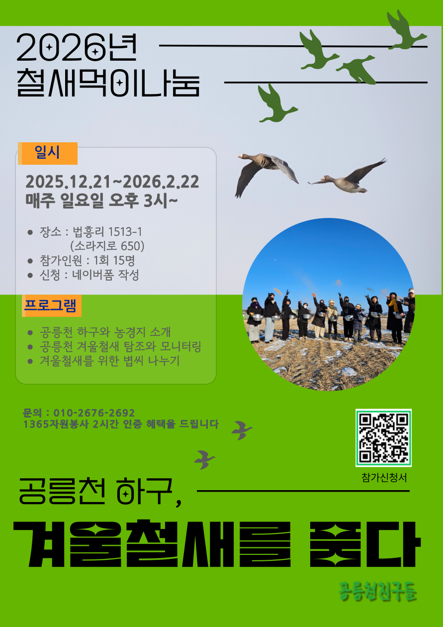 ※ 활동내용: 공릉천 하구 농경지 주변 겨울철새를 위한 먹이(볍씨) 주기 활동, 겨울철새 보호를 위한 인식증진활동, 겨울철새 모니터링