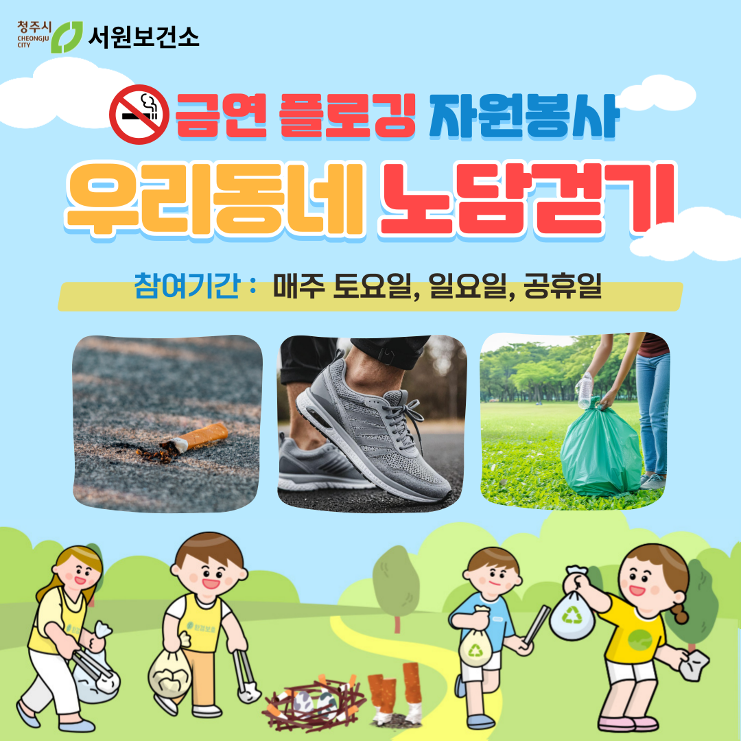 청주시 서원보건소와 함께하는 금연 비대면 자원봉사 “우리동네 노담걷기”에 참여하실 자원봉사자를 모집합니다.