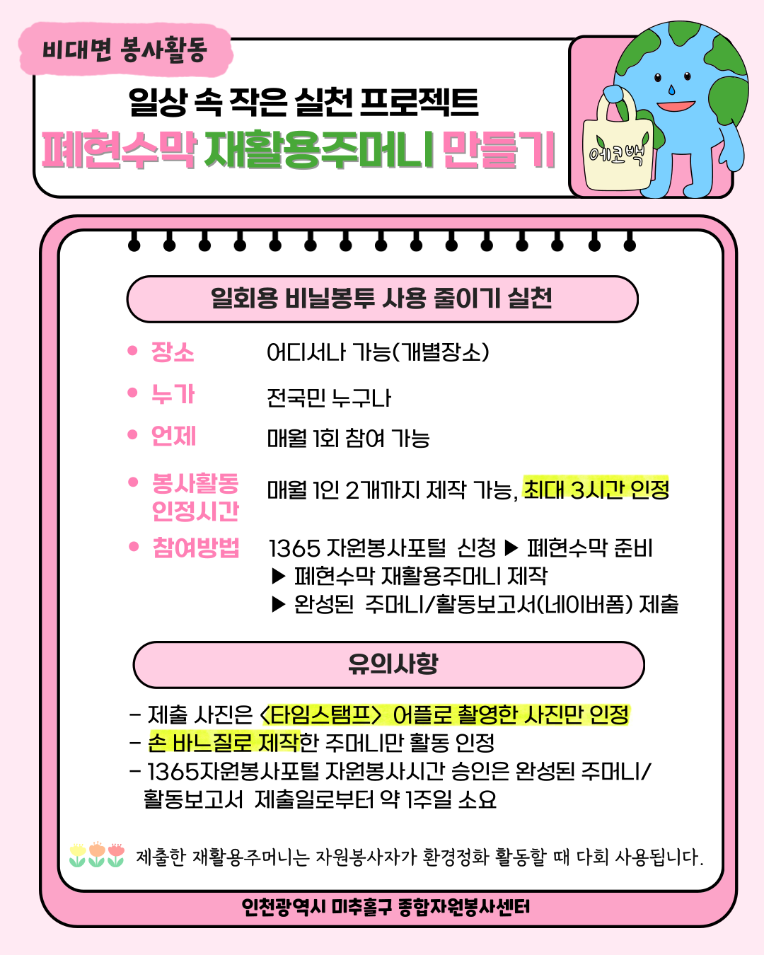 [미추홀구자원봉사센터] 2월 폐현수막 재활용 주머니 제작 및 나눔(비대면 활동) (모집중)