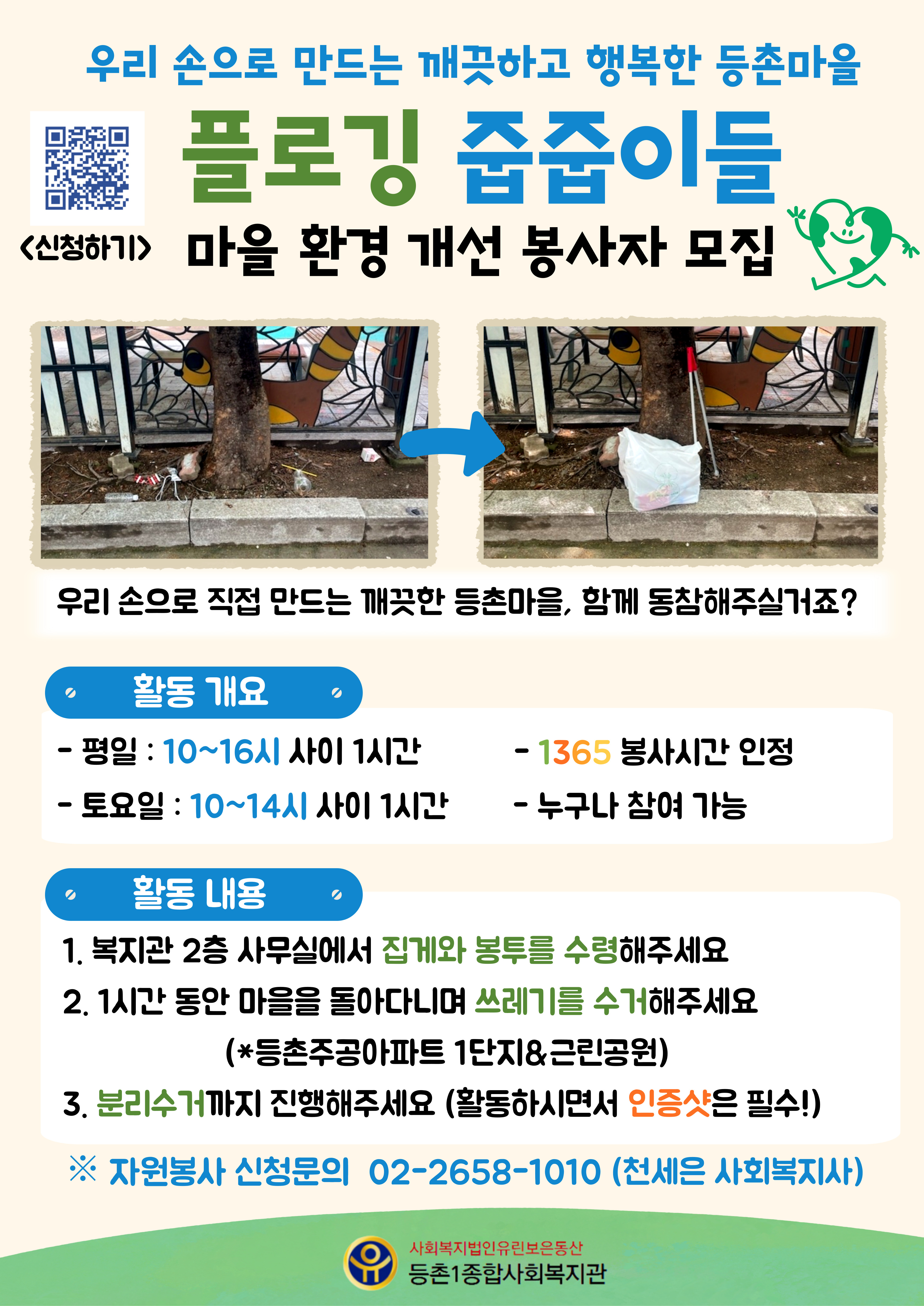 저희 기관에서는 등촌주공1단지아파트 및 근린공원 일대의 환경개선을 위하여 플로깅 자원봉사자 '줍줍이들'을 모집하고자 합니다.