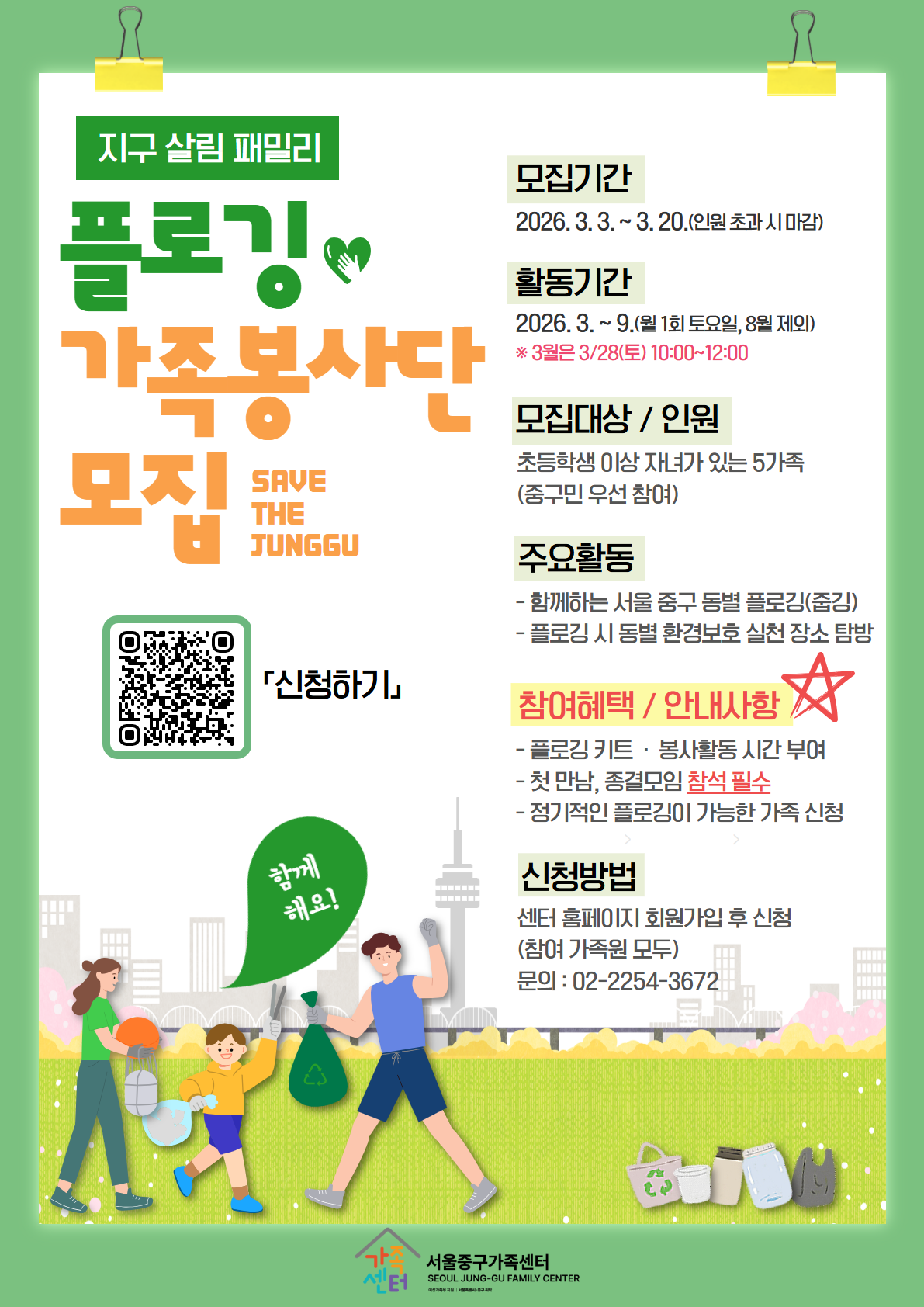 [서울중구가족센터] 2026년 초등학생 가족 대상 정기 플로깅 봉사단 활동(월 1회) 참여자 모집
